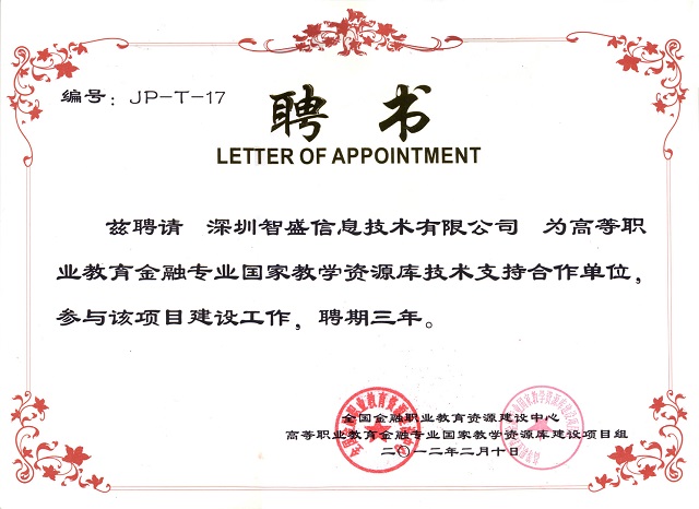 【金融資源庫(kù)項(xiàng)目組頒發(fā)給深圳市智盛信息技術(shù)有限公司的聘書(shū)】