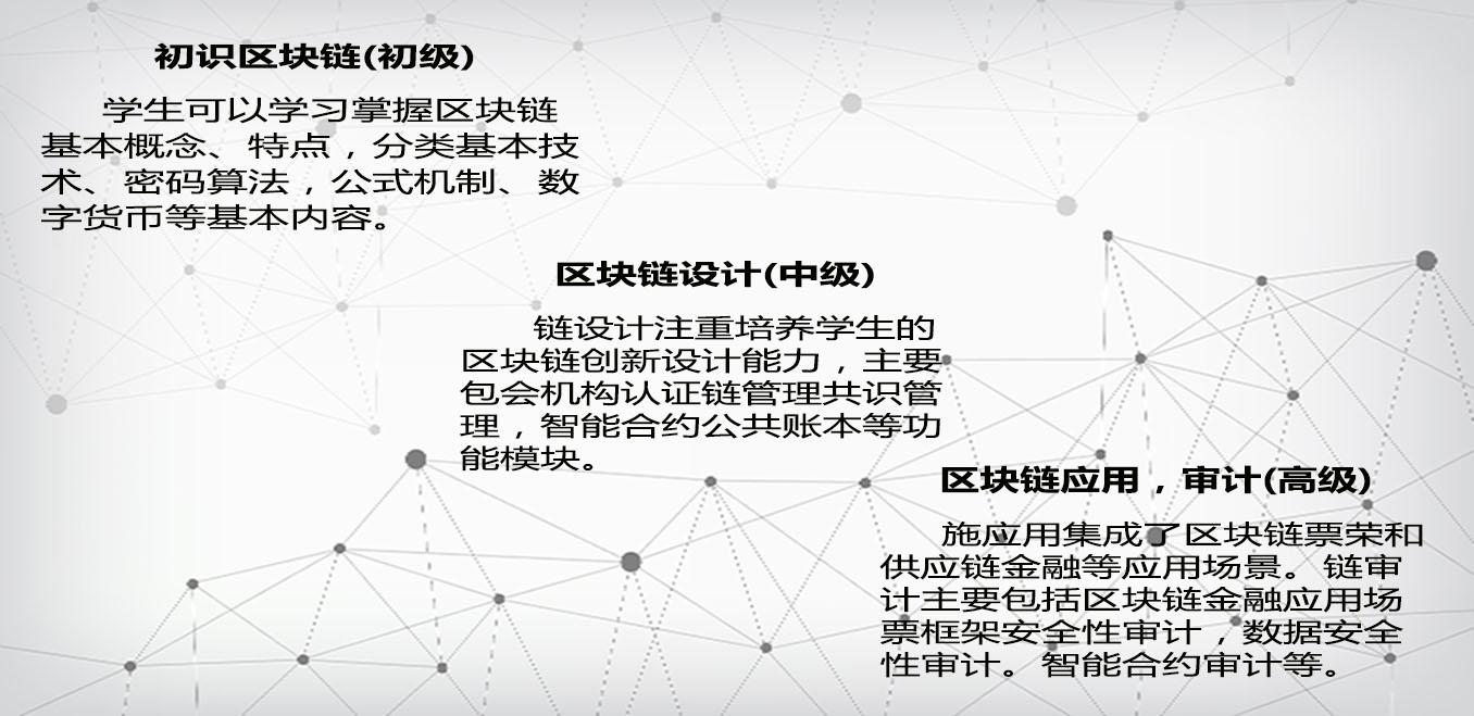 智能升級(jí):學(xué)生用戶分為初級(jí)、中級(jí)、高級(jí)三個(gè)級(jí)別,系統(tǒng)會(huì)根據(jù)對(duì)區(qū)塊鏈技術(shù)的掌握情況自動(dòng)升級(jí)用戶級(jí)別,并解鎖相應(yīng)的功能模塊,達(dá)到由低到高,循序漸進(jìn)掌握區(qū)塊鏈技術(shù)。