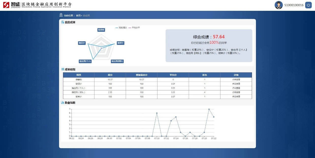 實(shí)驗(yàn)成果:系統(tǒng)根據(jù)學(xué)生的實(shí)際學(xué)習(xí)情況,自動(dòng)生成學(xué)習(xí)報(bào)告。根據(jù)系統(tǒng)提供的實(shí)驗(yàn)成果生成的數(shù)據(jù)信息,教師有針對(duì)性地指導(dǎo)學(xué)生更好地完成區(qū)塊鏈金融應(yīng)用學(xué)習(xí)任務(wù),提升學(xué)習(xí)效果。