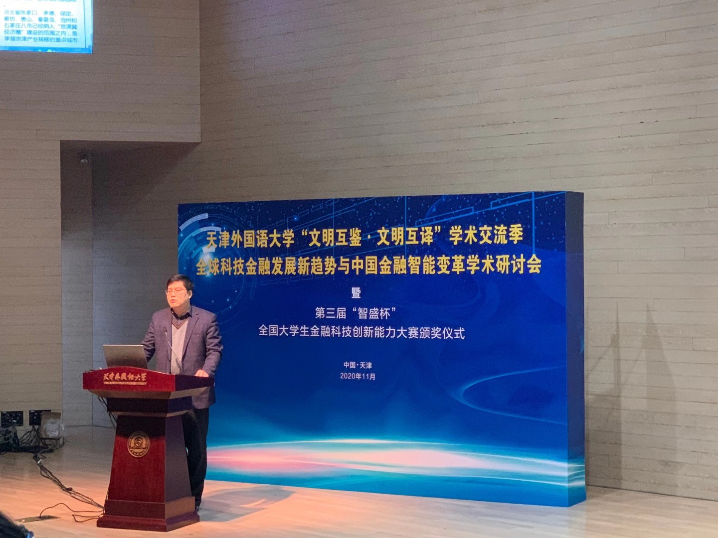 2020年11月8日,第三屆“智盛杯”全國大學生金融科技創(chuàng)新能力大賽頒獎儀式暨天津外國語大學“文明互鑒·文明互譯”學術交流季——“全球科技金融發(fā)展新趨勢與中國金融智能變革學術研討會”在天津外國語大學馬場道校區(qū)隆重舉行。此次頒獎儀式采取線上線下融合方式舉辦,未能到達現(xiàn)場的參會人員通過騰訊會議直播參加。