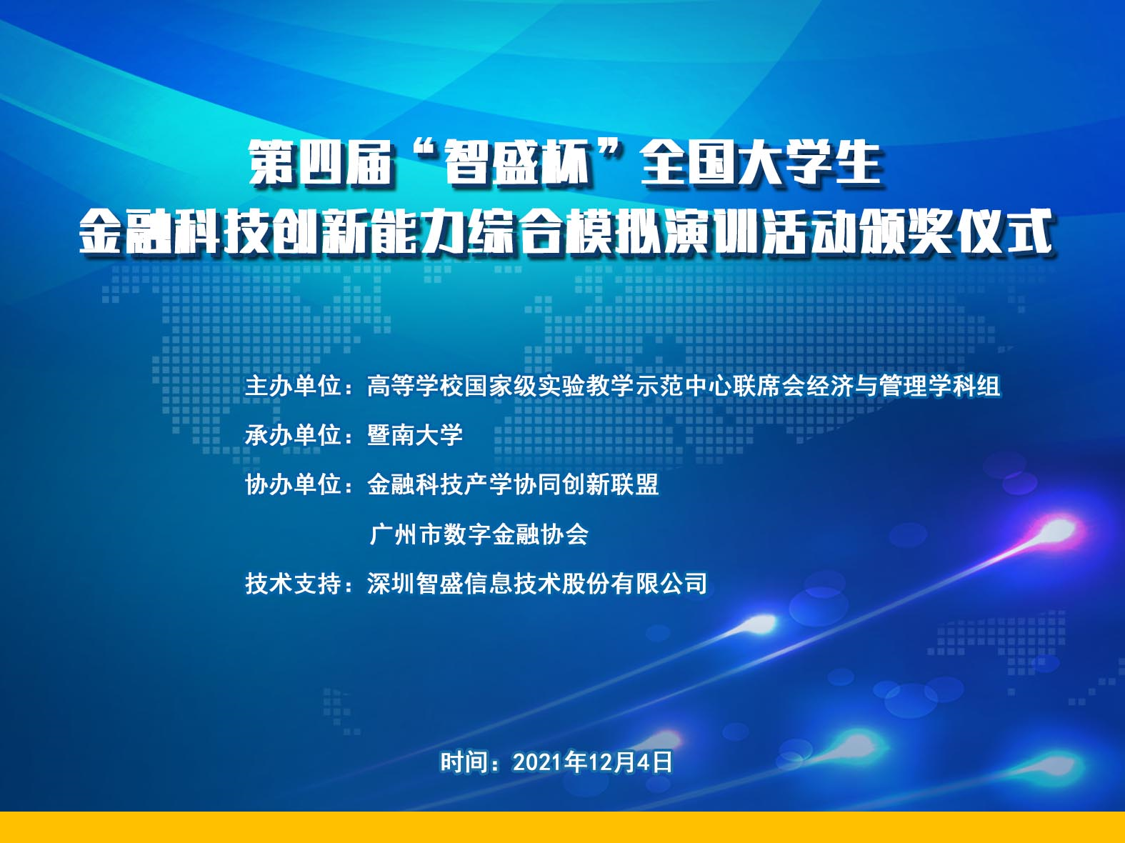 2021年12月4日,由高等學(xué)校國家級(jí)實(shí)驗(yàn)教學(xué)示范中心聯(lián)席會(huì)經(jīng)濟(jì)與管理學(xué)科組主辦;暨南大學(xué)承辦;金融科技產(chǎn)學(xué)協(xié)同創(chuàng)新聯(lián)盟和廣州市數(shù)字金融協(xié)會(huì)協(xié)辦;深圳智盛信息技術(shù)股份有限公司作為技術(shù)支持的第四屆“智盛杯”全國大學(xué)生金融科技創(chuàng)新能力大賽頒獎(jiǎng)儀式正式收官。此次頒獎(jiǎng)儀式采取線上方式通過以騰訊會(huì)議直播的形式參加。