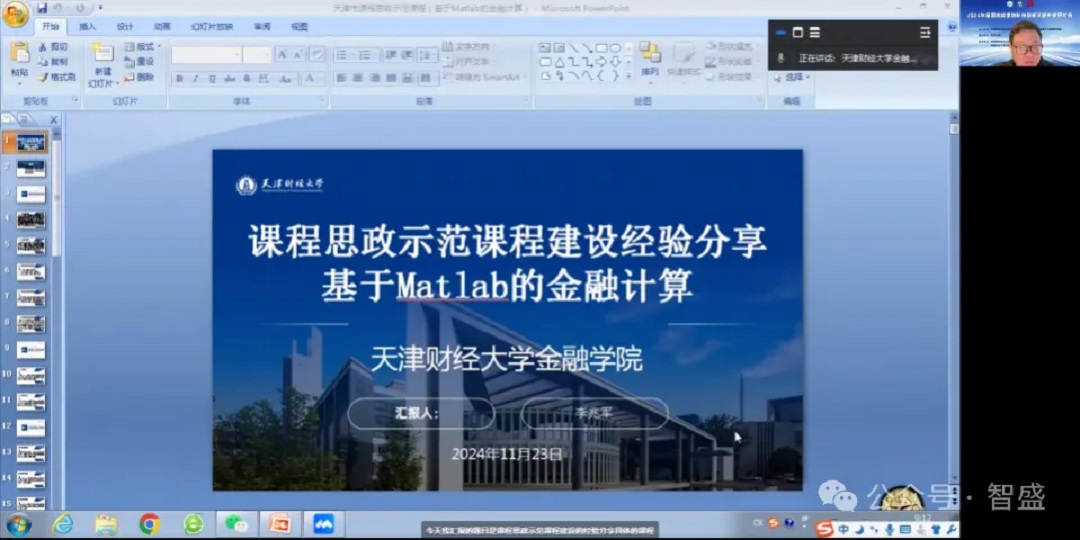 天津財經(jīng)大學金融學院李兆軍教授就基于 Matlab 的金融計算課程思政示范課程建設作經(jīng)驗分享。他先介紹課程由《金融計算與量化分析》教改而來,經(jīng)歷疫情上網(wǎng)課等,已獲校、市相關成果。接著從課程基本情況、目標完成、教學手段、思政結合、改革創(chuàng)新點五方面展開匯報,提及依據(jù)教育部文件開展建設,闡述課程各模塊內容、考核方式,強調教學手段多樣,如講知識、小組討論、案例教學等,還談及網(wǎng)絡資源利用及思政融入需注意事項,包括突出職業(yè)、愛國、擔當、工匠精神等,最后總結課程的基本指標、創(chuàng)新點及建設過程是不斷完善的。